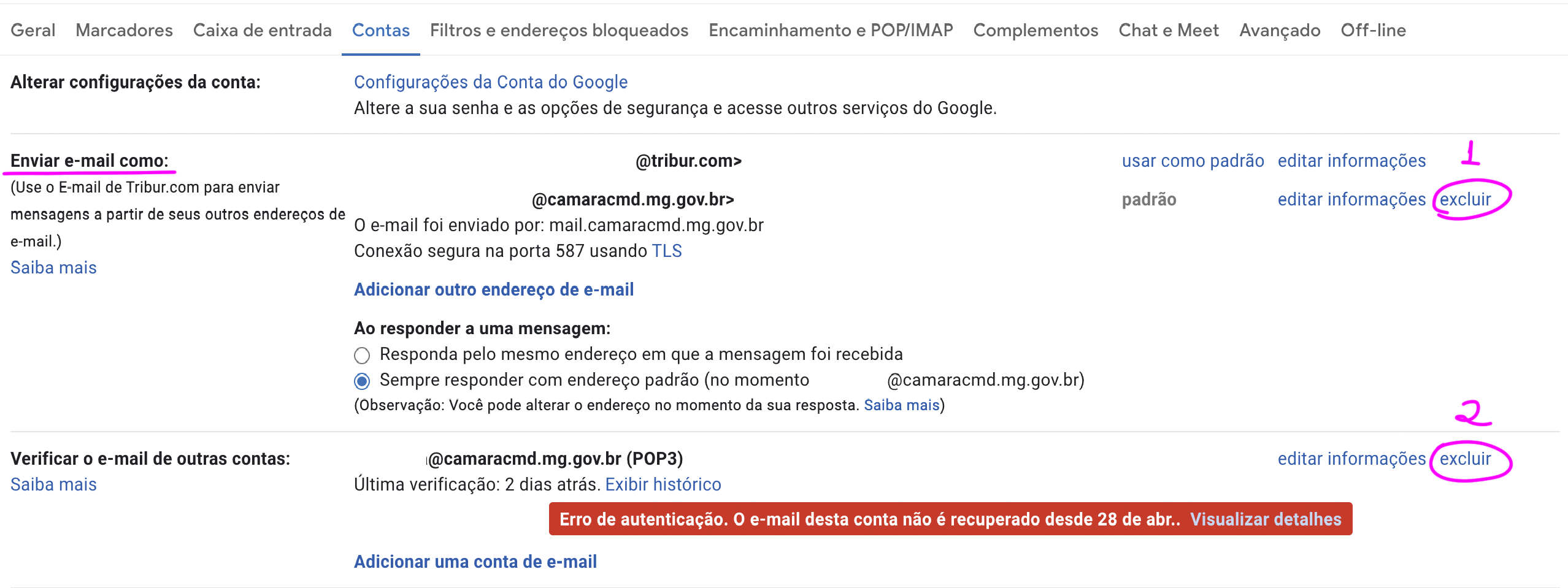 Agora precisamos adicionar novamente a conta @camaracmd.gov.br com as configurações originais.