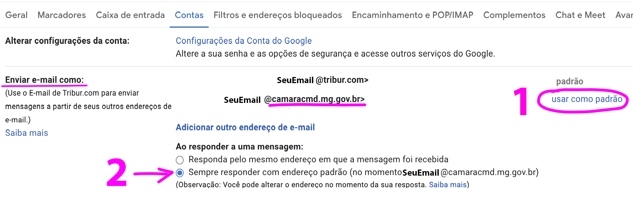 1 - Clique em usar como padrão ao lado do o email @camaracmd.mg.gov.br